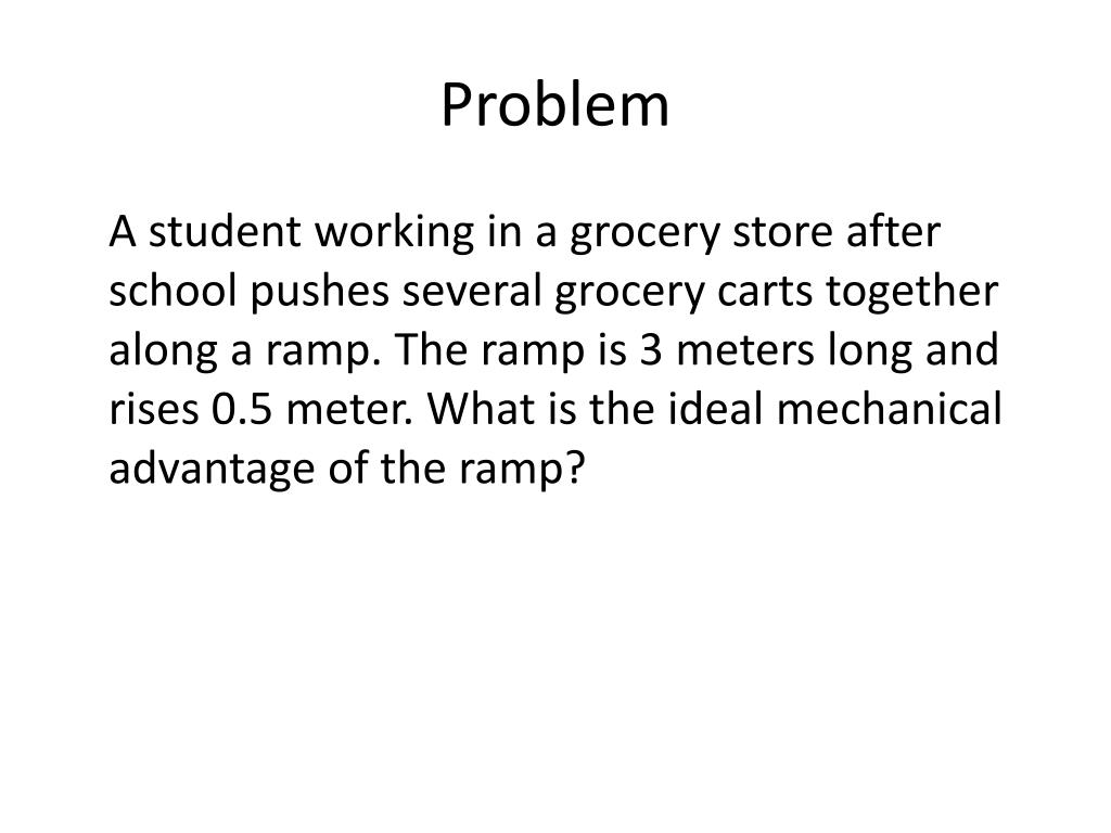 Problem A student working in a grocery store after school pushes several grocery carts together along a ramp. The ramp is 3 meters long and rises 0.5 meter. What is the ideal mechanical advantage of the ramp?