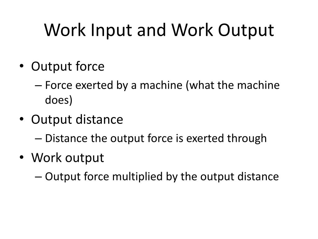 Work Input and Work Output • Output force • Force exerted by a machine (what the machine does) • Output distance • Distance the output force is exerted through • Work output • Output force multiplied by the output distance