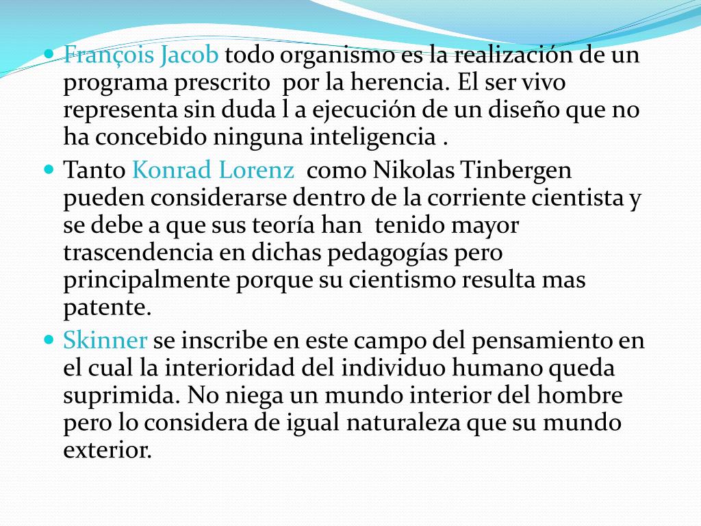 François Jacob todo organismo es la realización de un programa prescrito por la herencia. El ser vivo representa sin duda l a ejecución de un diseño que no ha concebido ninguna inteligencia . • Tanto Konrad Lorenz como Nikolas Tinbergen pueden considerarse dentro de la corriente cientista y se debe a que sus teoría han tenido mayor trascendencia en dichas pedagogías pero principalmente porque su cientismo resulta mas patente. • Skinner se inscribe en este campo del pensamiento en el cual la interioridad del individuo humano queda suprimida. No niega un mundo interior del hombre pero lo considera de igual naturaleza que su mundo exterior.