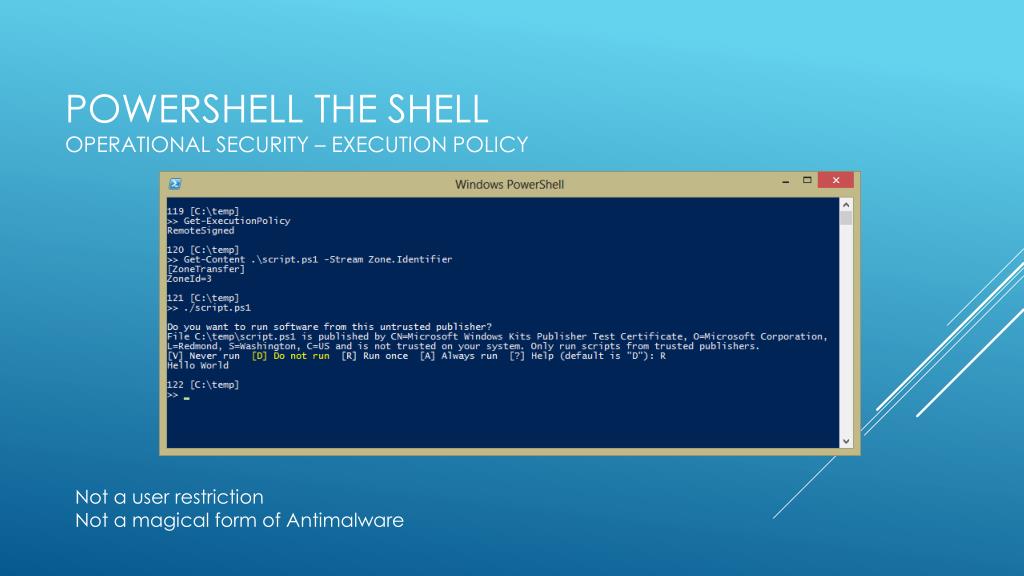 PowerShell the ShellOperational Security – Execution Policy Not a user restriction Not a magical form of Antimalware