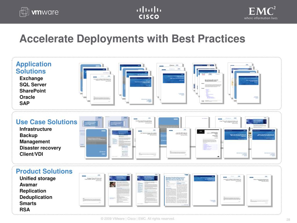 Accelerate Deployments with Best Practices • Application Solutions • Exchange • SQL Server • SharePoint • Oracle • SAP • Use Case Solutions • Infrastructure • Backup • Management • Disaster recovery • Client/VDI • Product Solutions • Unified storage • Avamar • Replication • Deduplication • Smarts • RSA