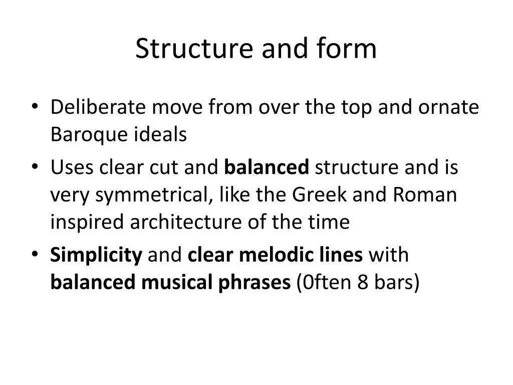 Structure and form • Deliberate move from over the top and ornate Baroque ideals • Uses clear cut and balanced structure and is very symmetrical, like the Greek and Roman inspired architecture of the time • Simplicity and clear melodic lines with balanced musical phrases (0ften 8 bars)