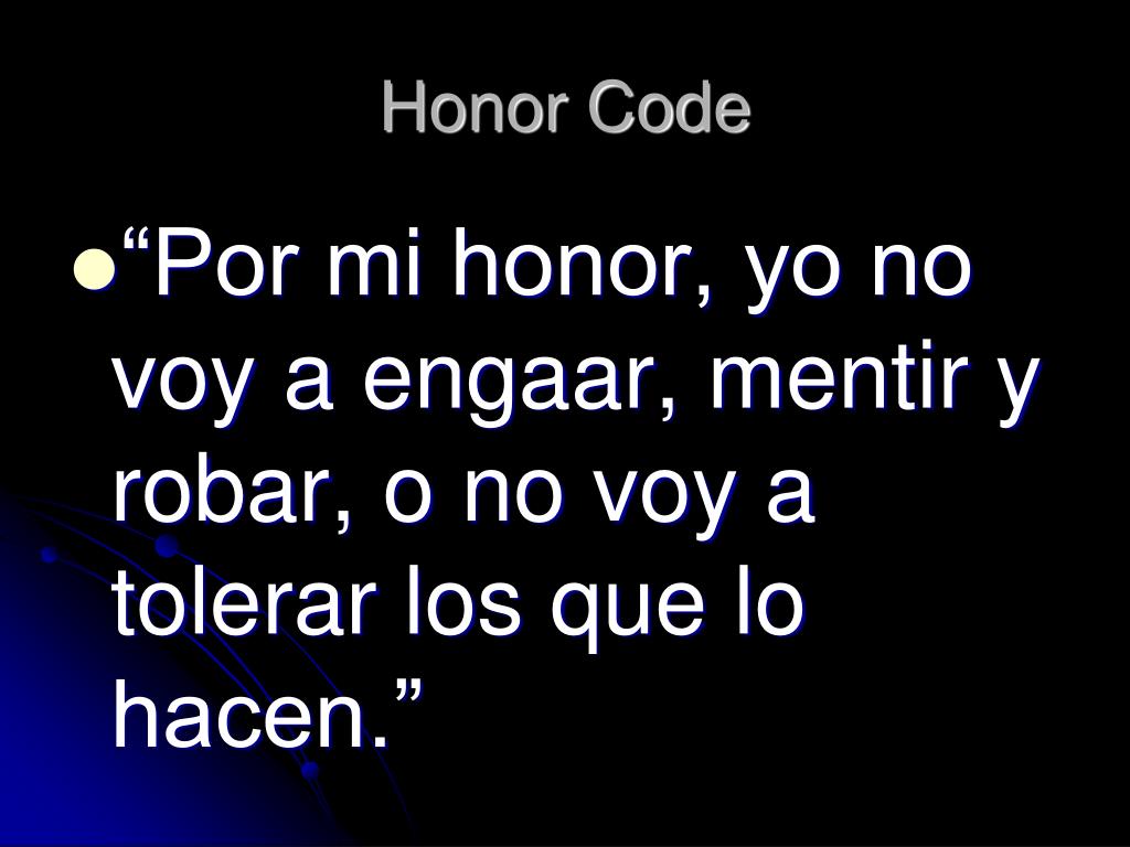 Honor Code • “Por mi honor, yo no voy a engaar, mentir y robar, o no voy a tolerar los que lo hacen.”