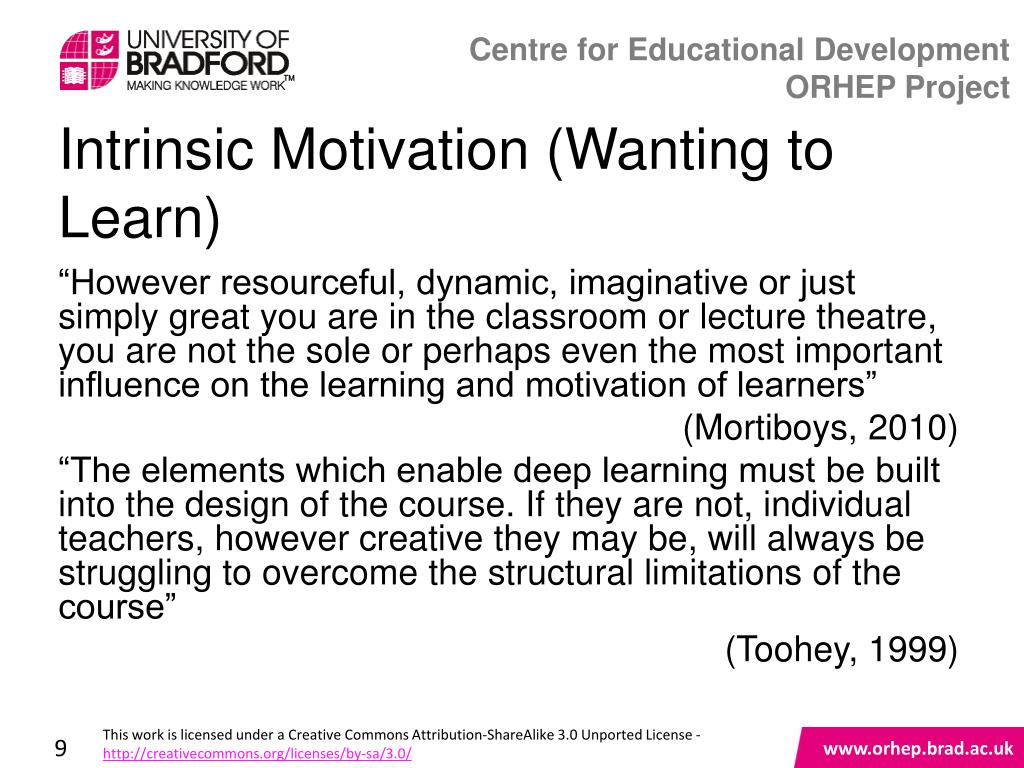 Intrinsic Motivation (Wanting to Learn) “However resourceful, dynamic, imaginative or just simply great you are in the classroom or lecture theatre, you are not the sole or perhaps even the most important influence on the learning and motivation of learners” (Mortiboys, 2010) “The elements which enable deep learning must be built into the design of the course. If they are not, individual teachers, however creative they may be, will always be struggling to overcome the structural limitations of the course” (Toohey, 1999)
