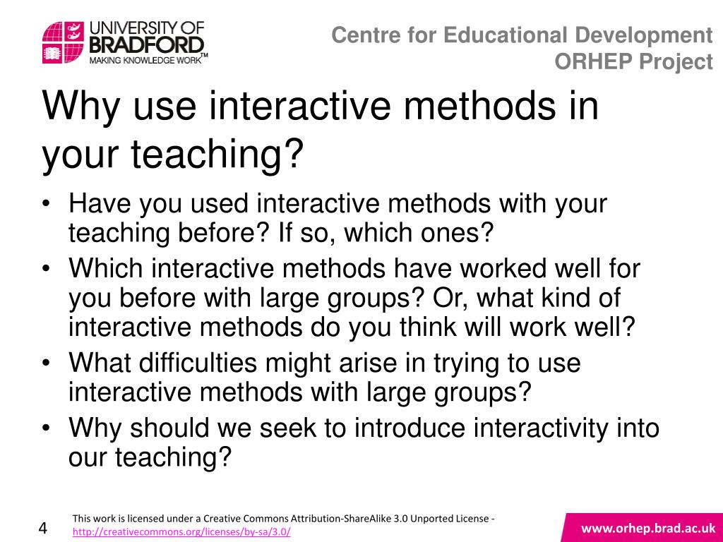 Why use interactive methods in your teaching? Have you used interactive methods with your teaching before? If so, which ones? Which interactive methods have worked well for you before with large groups? Or, what kind of interactive methods do you think will work well? What difficulties might arise in trying to use interactive methods with large groups? Why should we seek to introduce interactivity into our teaching?