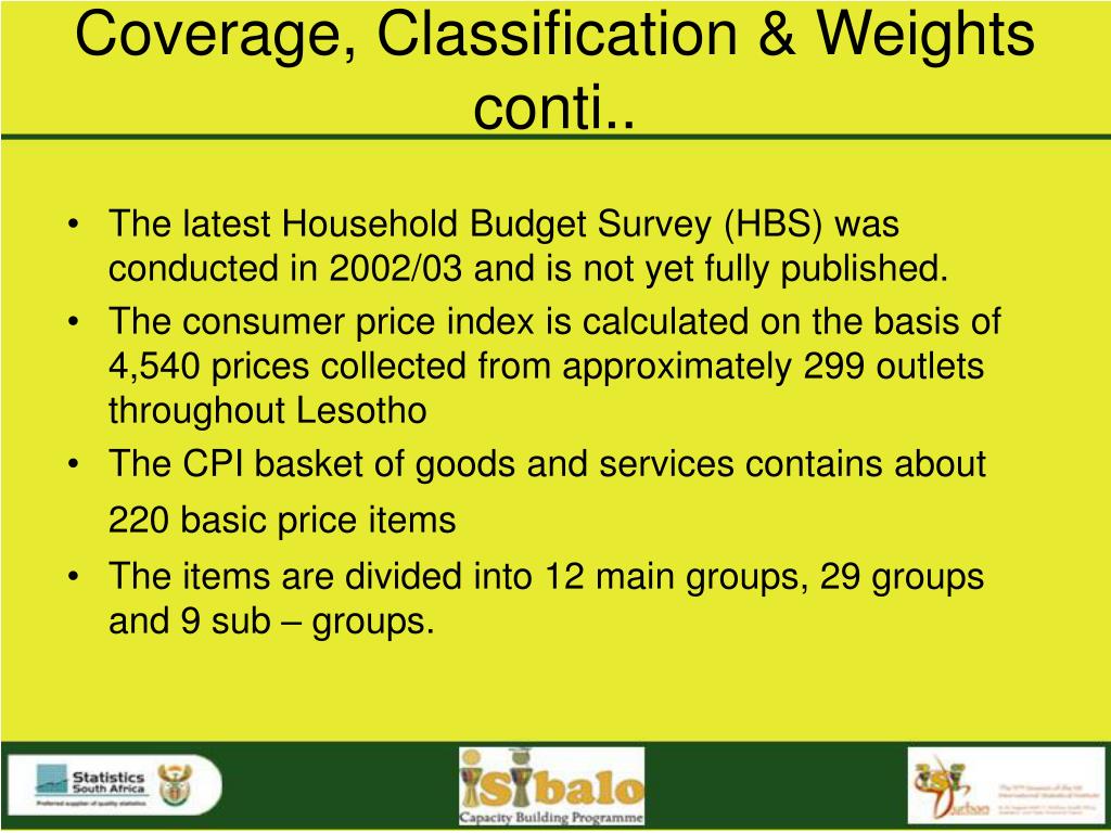 Coverage, Classification & Weights conti.. • The latest Household Budget Survey (HBS) was conducted in 2002/03 and is not yet fully published. • The consumer price index is calculated on the basis of 4,540 prices collected from approximately 299 outlets throughout Lesotho • The CPI basket of goods and services contains about 220 basic price items • The items are divided into 12 main groups, 29 groups and 9 sub – groups.