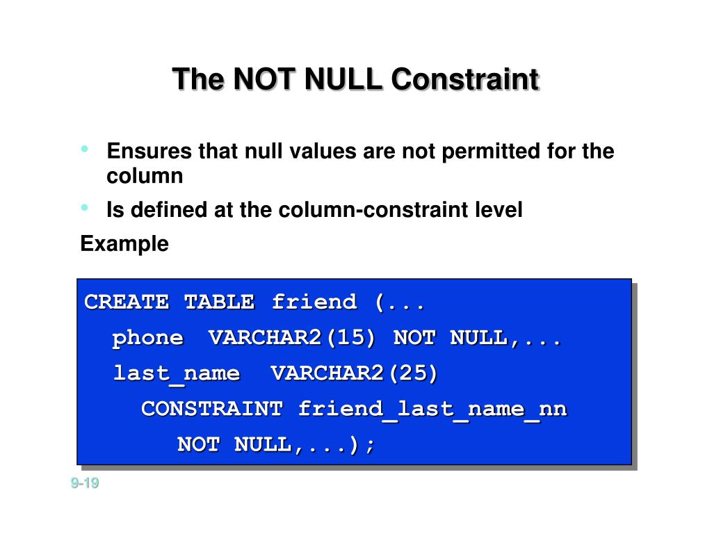 The NOT NULL Constraint • Ensures that null values are not permitted for the column • Is defined at the column-constraint level Example CREATE TABLE friend (... phone VARCHAR2(15) NOT NULL,... last_name VARCHAR2(25) CONSTRAINT friend_last_name_nn NOT NULL,...);
