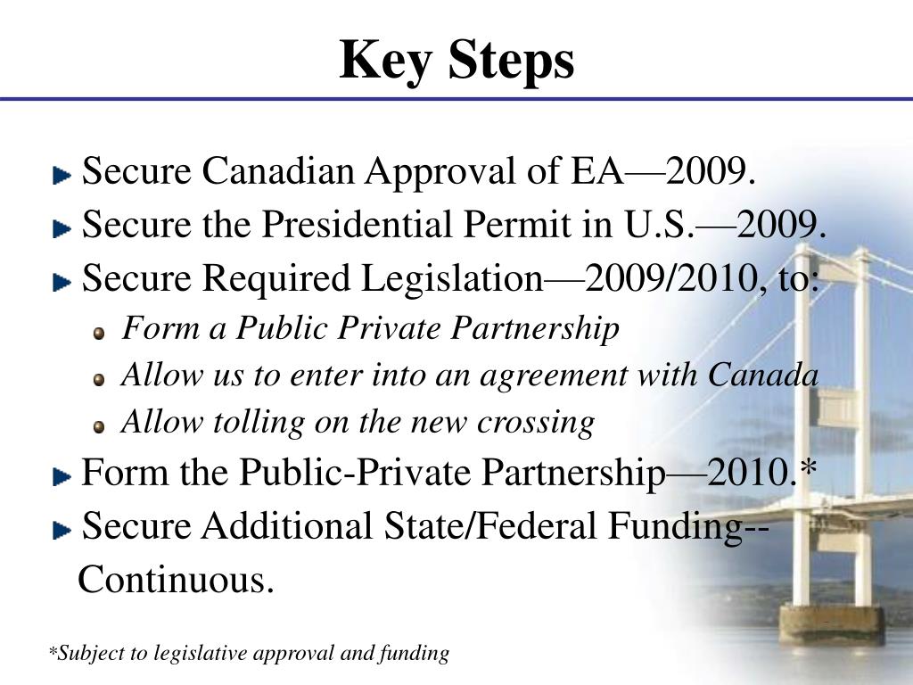 Key Steps • Secure Canadian Approval of EA—2009. • Secure the Presidential Permit in U.S.—2009. • Secure Required Legislation—2009/2010, to: • Form a Public Private Partnership • Allow us to enter into an agreement with Canada • Allow tolling on the new crossing • Form the Public-Private Partnership—2010.* • Secure Additional State/Federal Funding-- Continuous. *Subject to legislative approval and funding