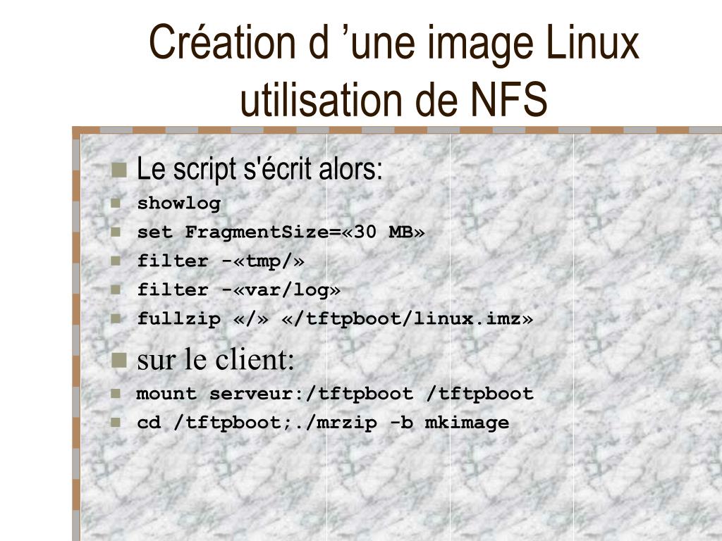Création d ’une image Linux • L ’utilitaire se nomme mrzip. • Exemple de script : mkimg.mrz • showlog • set FragmentSize="30 MB" • filter -"tmp/" • filter -"var/log" • filter -"/image" • fullzip "/" "/image/linux.imz" • commande : mrzip -b mkimg • n fichiers linux.im* de 30 Mo