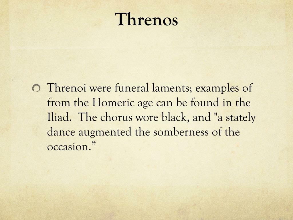 Threnos • Threnoi were funeral laments; examples of from the Homeric age can be found in the Iliad. The chorus wore black, and "a stately dance augmented the somberness of the occasion.”