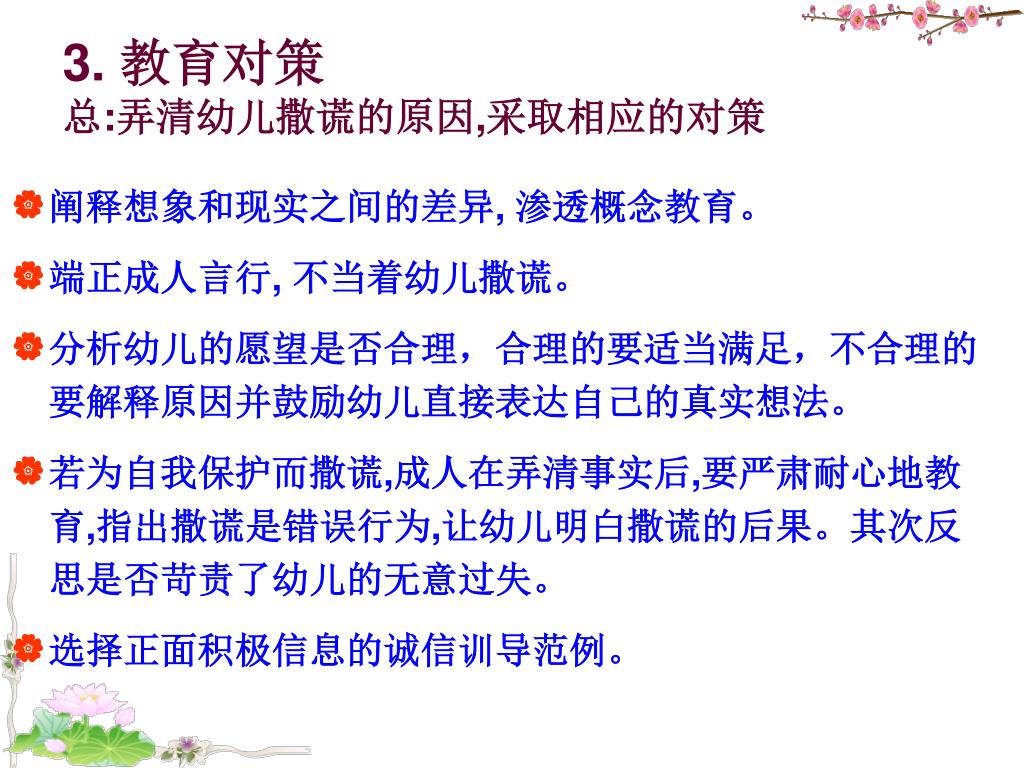 阐释想象和现实之间的差异, 渗透概念教育。 端正成人言行, 不当着幼儿撒谎。 分析幼儿的愿望是否合理,合理的要适当满足,不合理的要解释原因并鼓励幼儿直接表达自己的真实想法。 若为自我保护而撒谎,成人在弄清事实后,要严肃耐心地教育,指出撒谎是错误行为,让幼儿明白撒谎的后果。其次反思是否苛责了幼儿的无意过失。 选择正面积极信息的诚信训导范例。 3. 教育对策总:弄清幼儿撒谎的原因,采取相应的对策
