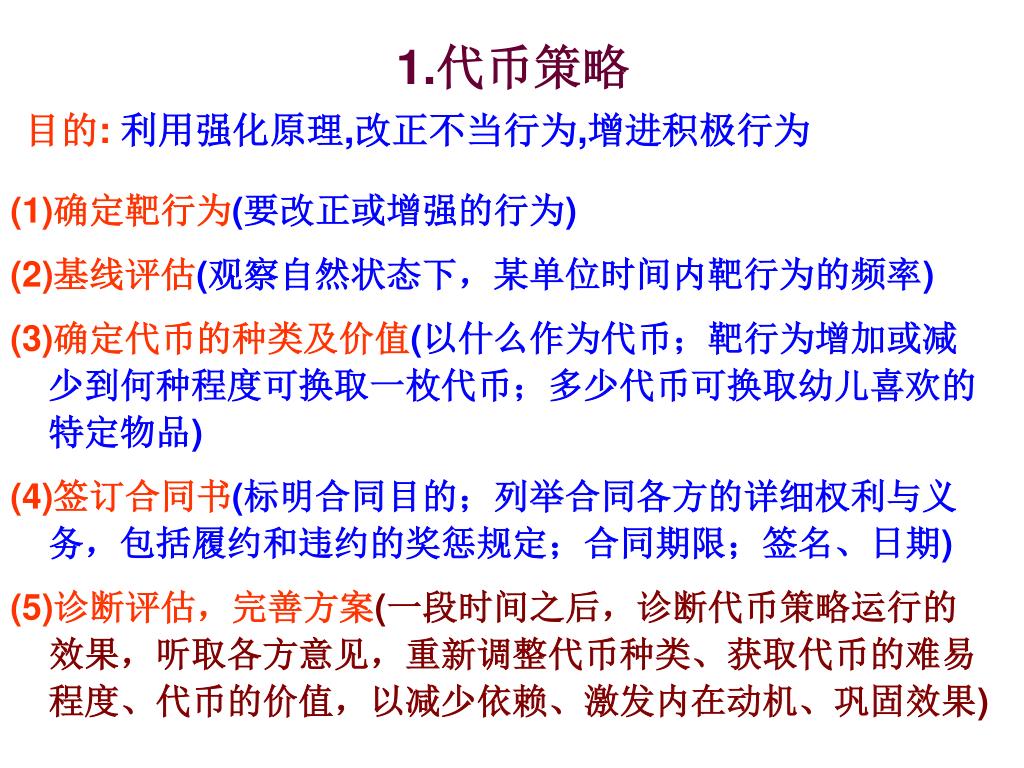 1.代币策略 目的: 利用强化原理,改正不当行为,增进积极行为 (1)确定靶行为(要改正或增强的行为) (2)基线评估(观察自然状态下,某单位时间内靶行为的频率) (3)确定代币的种类及价值(以什么作为代币;靶行为增加或减少到何种程度可换取一枚代币;多少代币可换取幼儿喜欢的特定物品) (4)签订合同书(标明合同目的;列举合同各方的详细权利与义务,包括履约和违约的奖惩规定;合同期限;签名、日期) (5)诊断评估,完善方案(一段时间之后,诊断代币策略运行的效果,听取各方意见,重新调整代币种类、获取代币的难易程度、代币的价值,以减少依赖、激发内在动机、巩固效果)