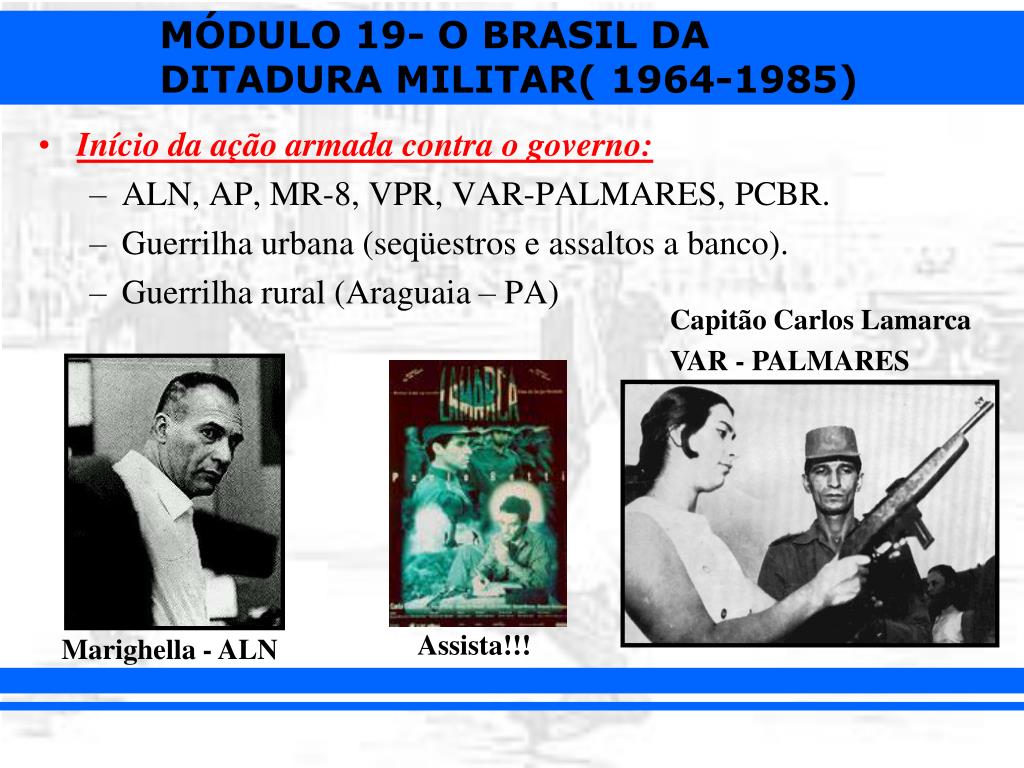 Início da ação armada contra o governo: • ALN, AP, MR-8, VPR, VAR-PALMARES, PCBR. • Guerrilha urbana (seqüestros e assaltos a banco). • Guerrilha rural (Araguaia – PA) Capitão Carlos Lamarca VAR - PALMARES Assista!!! Marighella - ALN