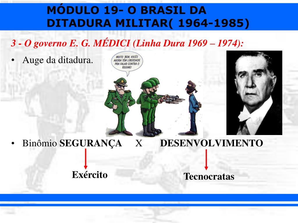 3 - O governo E. G. MÉDICI (Linha Dura 1969 – 1974): • Auge da ditadura. • Binômio SEGURANÇA X DESENVOLVIMENTO Exército Tecnocratas