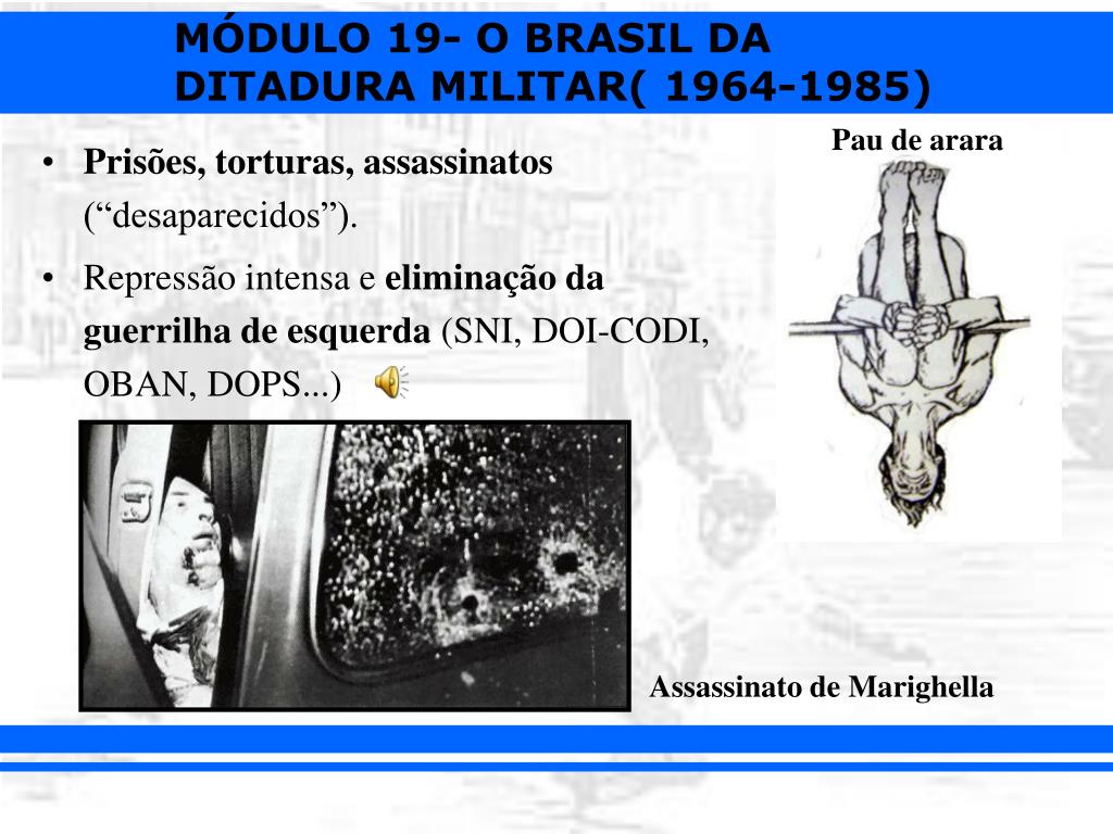 Pau de arara • Prisões, torturas, assassinatos (“desaparecidos”). • Repressão intensa e eliminação da guerrilha de esquerda (SNI, DOI-CODI, OBAN, DOPS...) Assassinato de Marighella