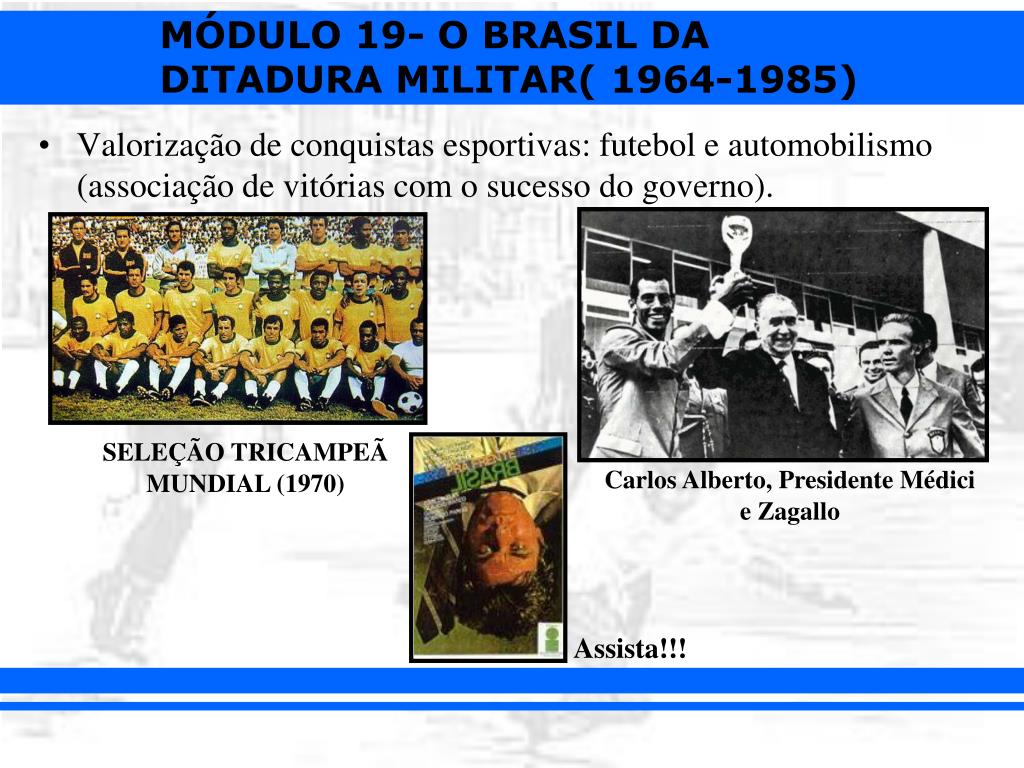 Valorização de conquistas esportivas: futebol e automobilismo (associação de vitórias com o sucesso do governo). SELEÇÃO TRICAMPEÃ MUNDIAL (1970) Carlos Alberto, Presidente Médici e Zagallo Assista!!!