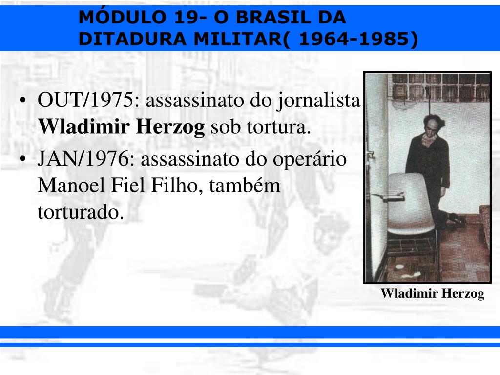 OUT/1975: assassinato do jornalista Wladimir Herzog sob tortura. • JAN/1976: assassinato do operário Manoel Fiel Filho, também torturado. Wladimir Herzog