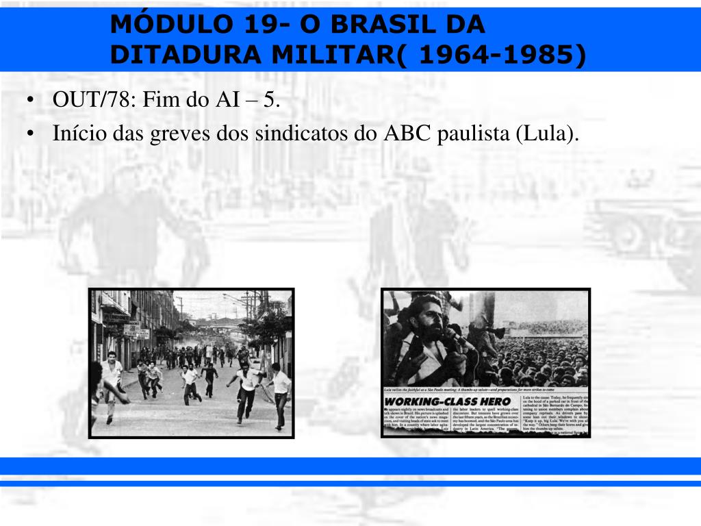 OUT/78: Fim do AI – 5. • Início das greves dos sindicatos do ABC paulista (Lula).