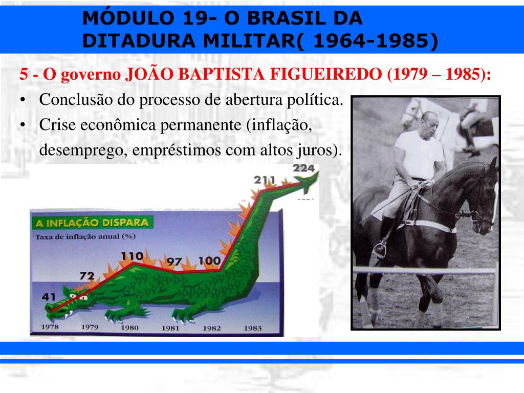 5 - O governo JOÃO BAPTISTA FIGUEIREDO (1979 – 1985): • Conclusão do processo de abertura política. • Crise econômica permanente (inflação, desemprego, empréstimos com altos juros). • Desgaste do governo.
