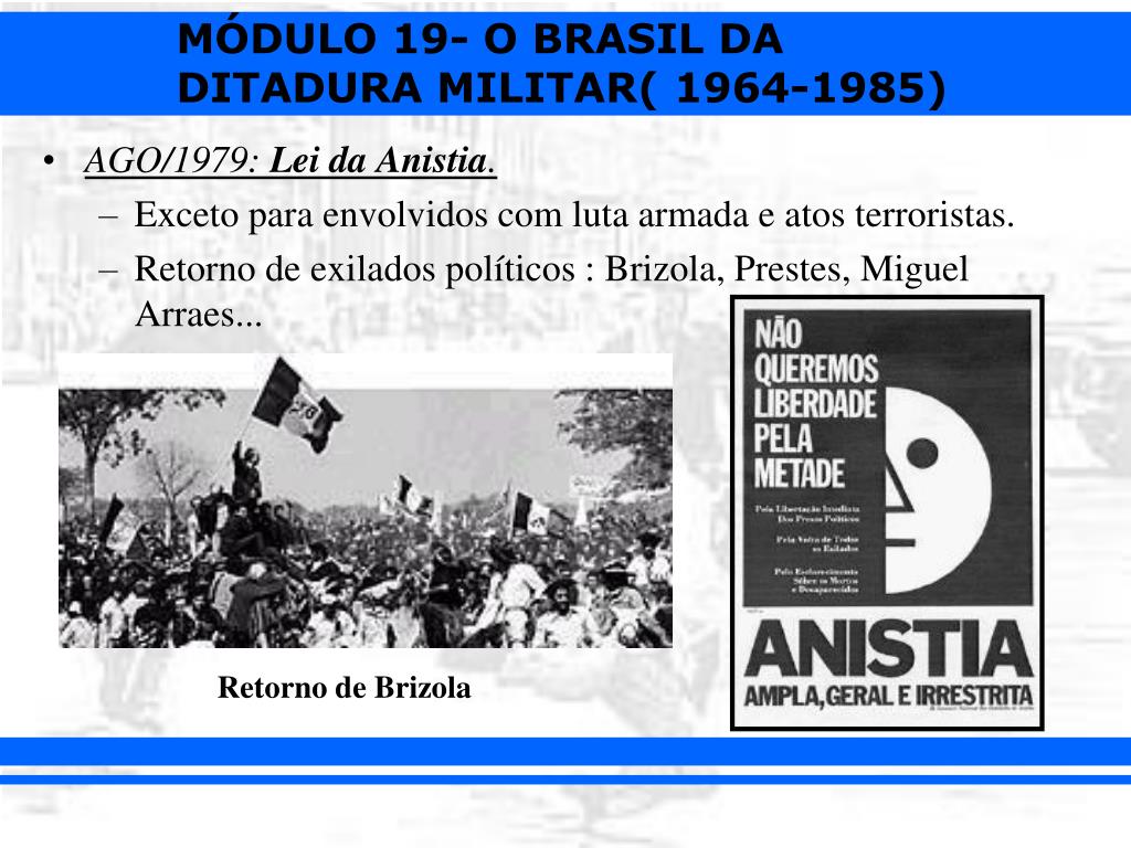 AGO/1979: Lei da Anistia. • Exceto para envolvidos com luta armada e atos terroristas. • Retorno de exilados políticos : Brizola, Prestes, Miguel Arraes... Retorno de Brizola