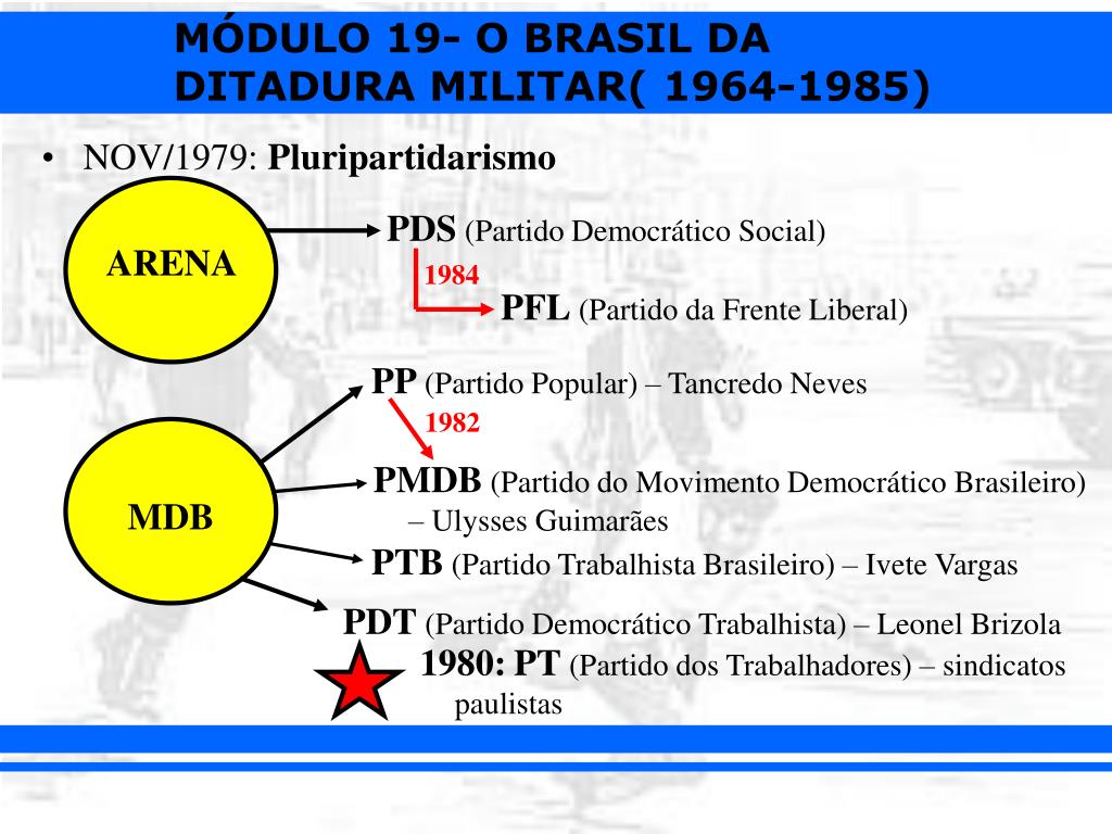 NOV/1979: Pluripartidarismo PDS (Partido Democrático Social) ARENA 1984 PFL (Partido da Frente Liberal) PP (Partido Popular) – Tancredo Neves 1982 PMDB (Partido do Movimento Democrático Brasileiro) – Ulysses Guimarães MDB PTB (Partido Trabalhista Brasileiro) – Ivete Vargas PDT (Partido Democrático Trabalhista) – Leonel Brizola 1980:PT (Partido dos Trabalhadores) – sindicatos paulistas