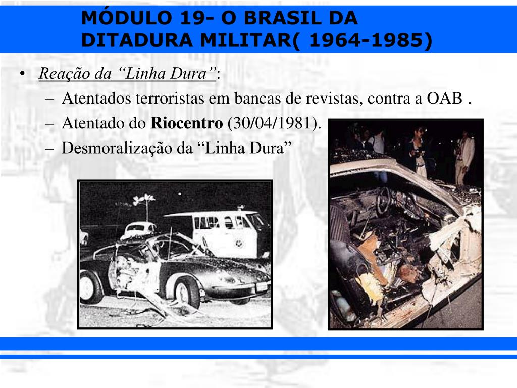 Reação da “Linha Dura”: • Atentados terroristas em bancas de revistas, contra a OAB . • Atentado do Riocentro (30/04/1981). • Desmoralização da “Linha Dura”