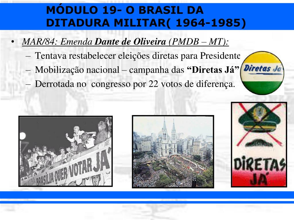 MAR/84: Emenda Dante de Oliveira (PMDB – MT): • Tentava restabelecer eleições diretas para Presidente da lica. • Mobilização nacional – campanha das “Diretas Já” • Derrotada no congresso por 22 votos de diferença.