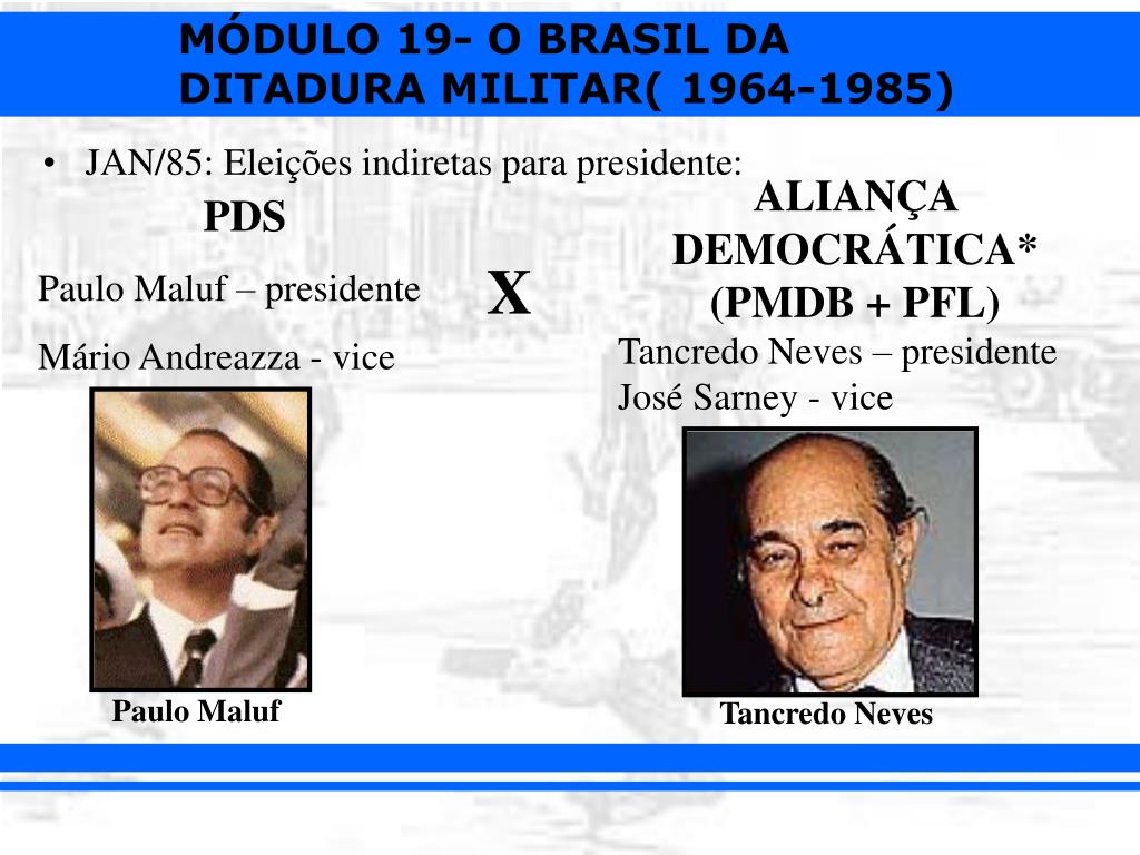 JAN/85: Eleições indiretas para presidente: PDS Paulo Maluf – presidente Mário Andreazza - vice ALIANÇA DEMOCRÁTICA* (PMDB + PFL) Tancredo Neves – presidente José Sarney - vice X Paulo Maluf Tancredo Neves