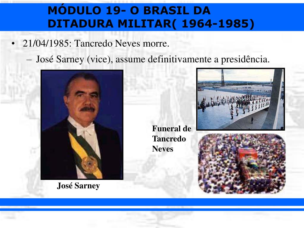 21/04/1985: Tancredo Neves morre. • José Sarney (vice), assume definitivamente a presidência. Funeral de Tancredo Neves José Sarney