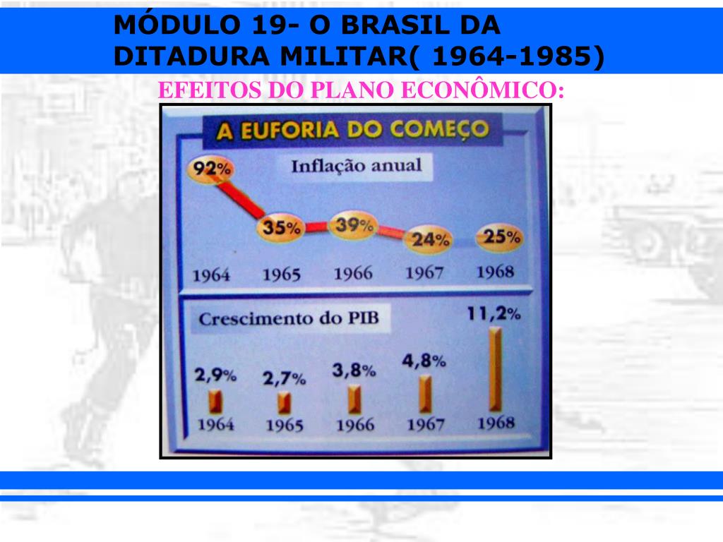 Milagre Econômico (1969 – 1974): • Delfim Netto (Ministro da economia). • Crescimento de 10% ao ano. • Facilidades de crédito (bens de consumo duráveis). • Arrocho salarial. • Grandes empréstimos.