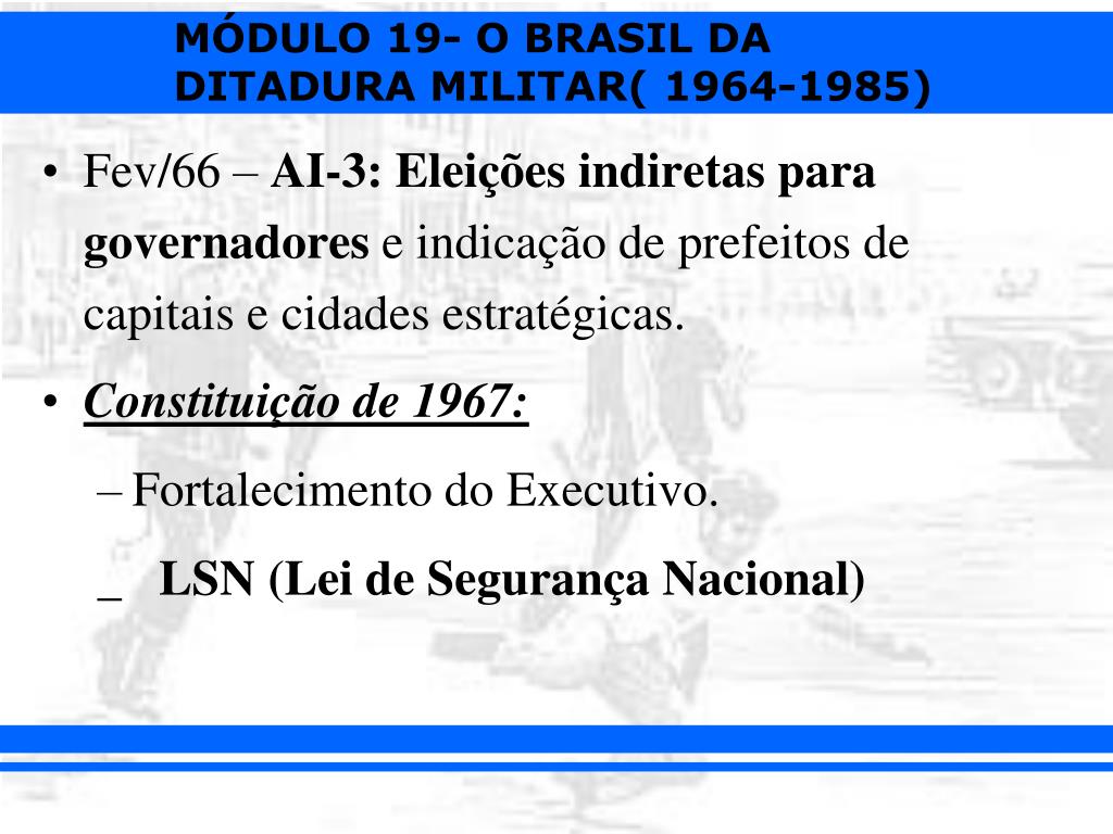 Fev/66 – AI-3: Eleições indiretas para governadores e indicação de prefeitos de capitais e cidades estratégicas. • Constituição de 1967: • Fortalecimento do Executivo. _ LSN (Lei de Segurança Nacional)