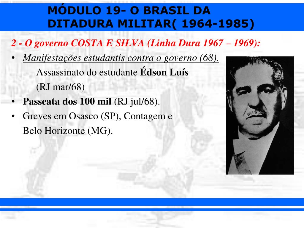 2 - O governo COSTA E SILVA (Linha Dura 1967 – 1969): • Manifestações estudantis contra o governo (68). • Assassinato do estudante Édson Luís (RJ mar/68) • Passeata dos 100 mil (RJ jul/68). • Greves em Osasco (SP), Contagem e Belo Horizonte (MG).