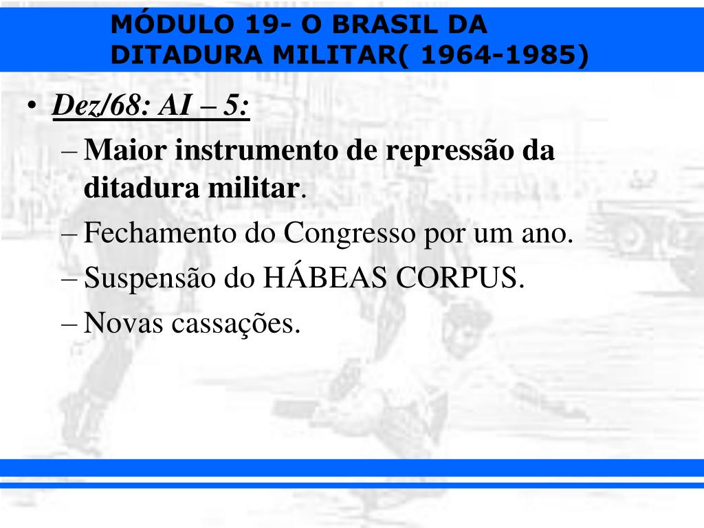 Dez/68: AI – 5: • Maior instrumento de repressão da ditadura militar. • Fechamento do Congresso por um ano. • Suspensão do HÁBEAS CORPUS. • Novas cassações.