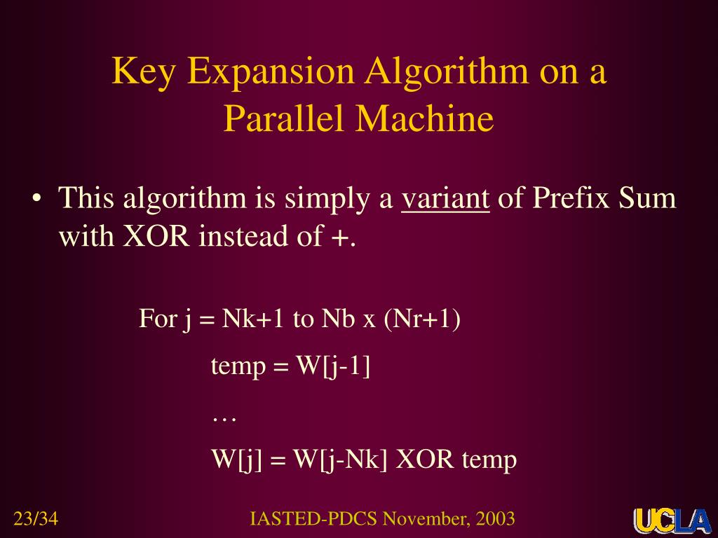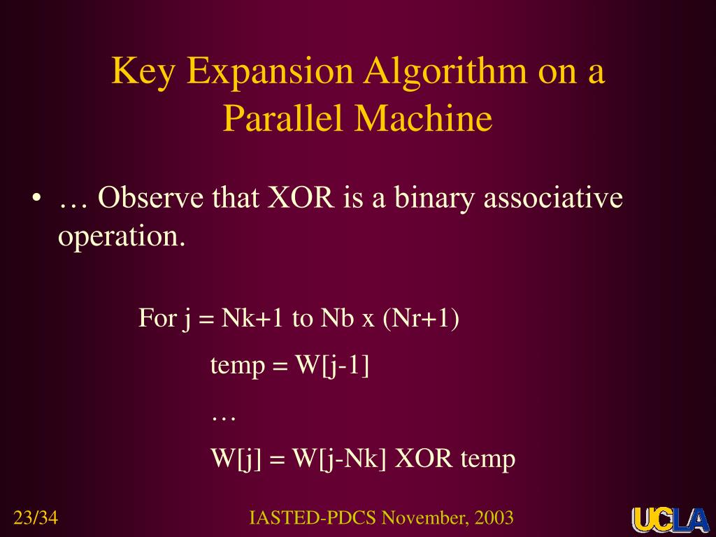 Key Expansion Algorithm on a Parallel Machine • … Observe that XOR is a binary associative operation. For j = Nk+1 to Nb x (Nr+1) temp = W[j-1] … W[j] = W[j-Nk] XOR temp 23/34 IASTED-PDCS November, 2003