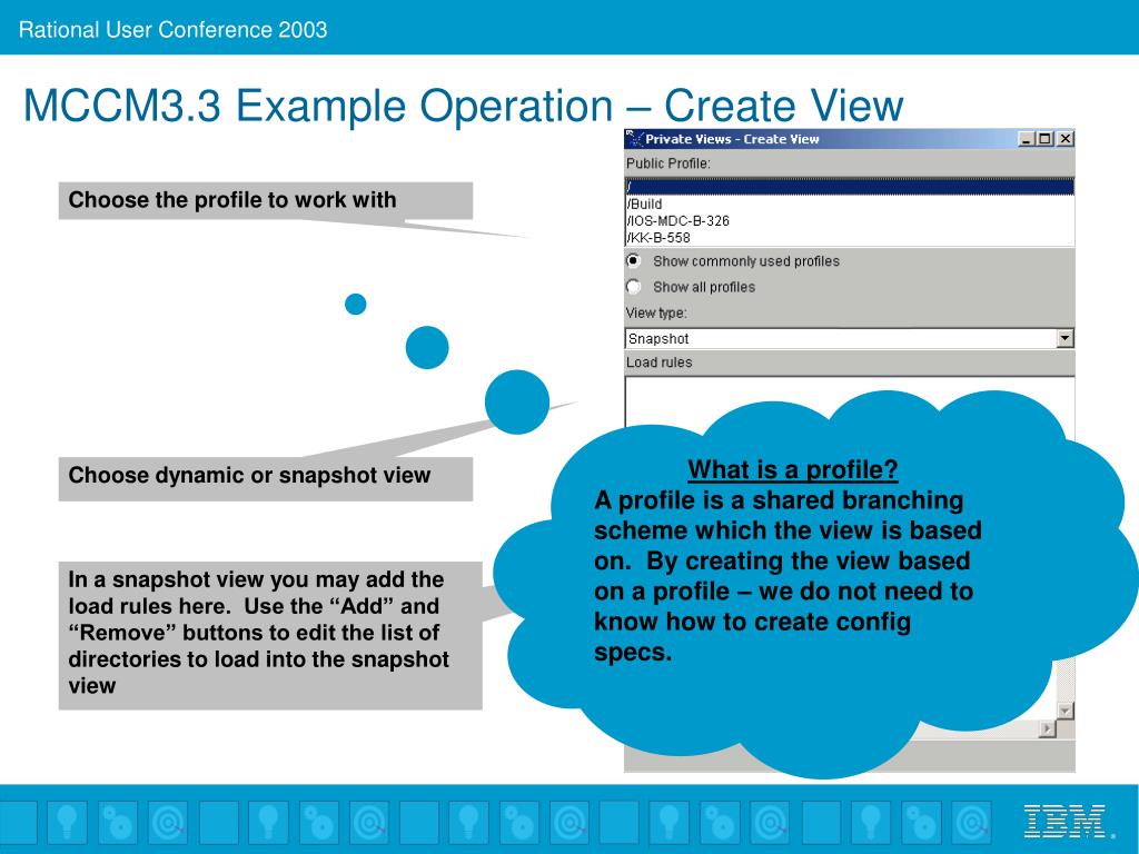 MCCM3.3 Example Operation – Create View Choose the profile to work with What is a profile? A profile is a shared branching scheme which the view is based on. By creating the view based on a profile – we do not need to know how to create config specs. Choose dynamic or snapshot view In a snapshot view you may add the load rules here. Use the “Add” and “Remove” buttons to edit the list of directories to load into the snapshot view