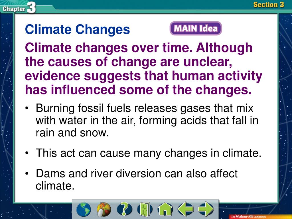 Climate Changes Climate changes over time. Although the causes of change are unclear, evidence suggests that human activity has influenced some of the changes. • Burning fossil fuels releases gases that mix with water in the air, forming acids that fall in rain and snow. • This act can cause many changes in climate. • Dams and river diversion can also affect climate. Section 3