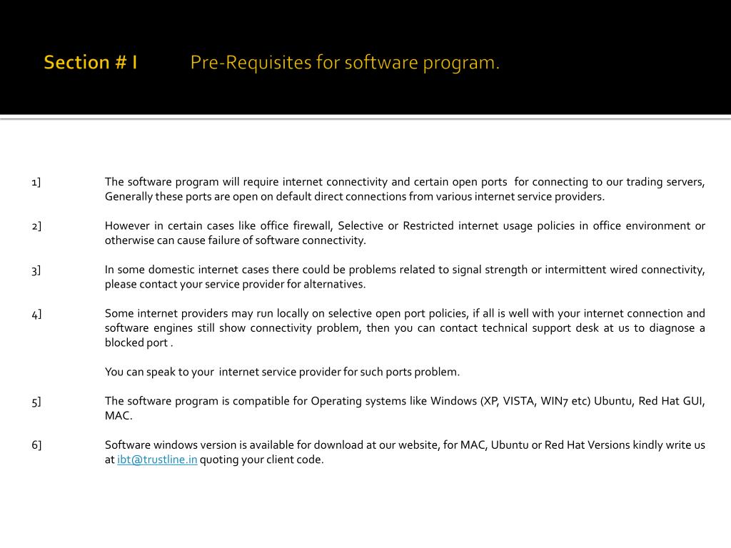 Section # I Pre-Requisites for software program. 1] The software program will require internet connectivity and certain open ports for connecting to our trading servers, Generally these ports are open on default direct connections from various internet service providers. 2] However in certain cases like office firewall, Selective or Restricted internet usage policies in office environment or otherwise can cause failure of software connectivity. 3] In some domestic internet cases there could be problems related to signal strength or intermittent wired connectivity, please contact your service provider for alternatives. 4] Some internet providers may run locally on selective open port policies, if all is well with your internet connection and software engines still show connectivity problem, then you can contact technical support desk at us to diagnose a blocked port . You can speak to your internet service provider for such ports problem. 5] The software program is compatible for Operating systems like Windows (XP, VISTA, WIN7 etc) Ubuntu, Red Hat GUI, MAC. 6] Software windows version is available for download at our website, for MAC, Ubuntu or Red Hat Versions kindly write us at ibt@trustline.in quoting your client code.
