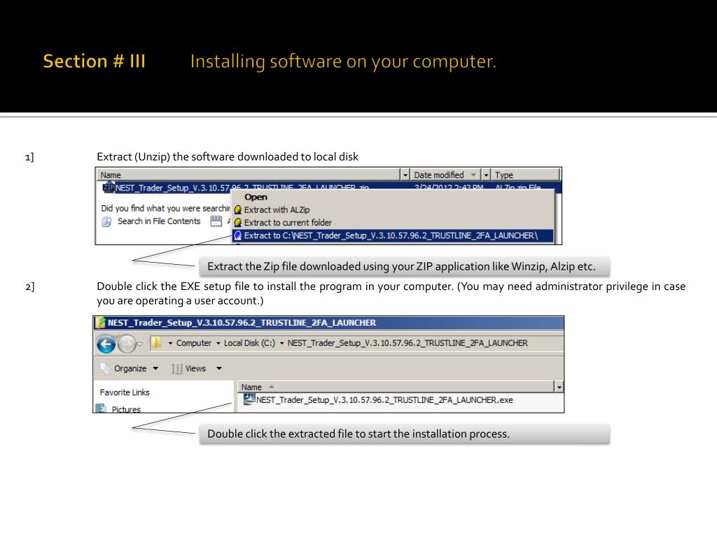 Section # III Installing software on your computer. 1] Extract (Unzip) the software downloaded to local disk Extract the Zip file downloaded using your ZIP application like Winzip, Alzip etc. 2] Double click the EXE setup file to install the program in your computer. (You may need administrator privilege in case you are operating a user account.) Double click the extracted file to start the installation process.