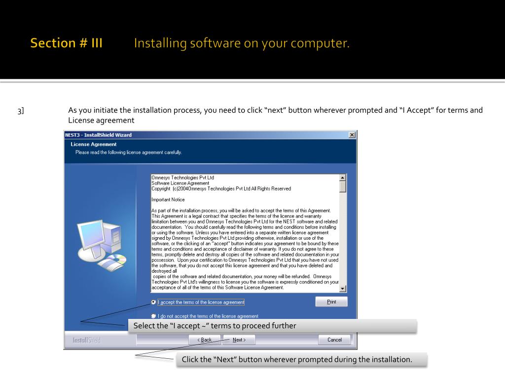 Section # III Installing software on your computer. 3] As you initiate the installation process, you need to click “next” button wherever prompted and “I Accept” for terms and License agreement Select the “I accept ~” terms to proceed further Click the “Next” button wherever prompted during the installation.