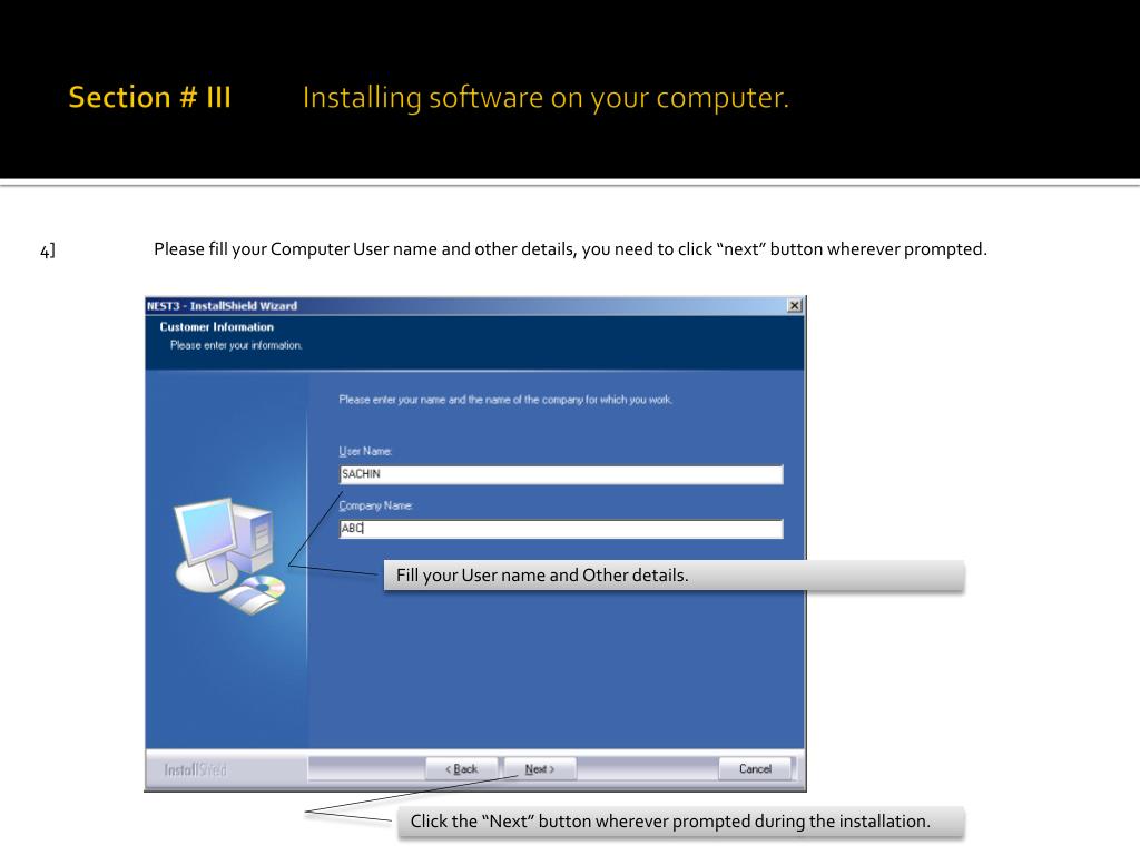 Section # III Installing software on your computer. 4] Please fill your Computer User name and other details, you need to click “next” button wherever prompted. Fill your User name and Other details. Click the “Next” button wherever prompted during the installation.