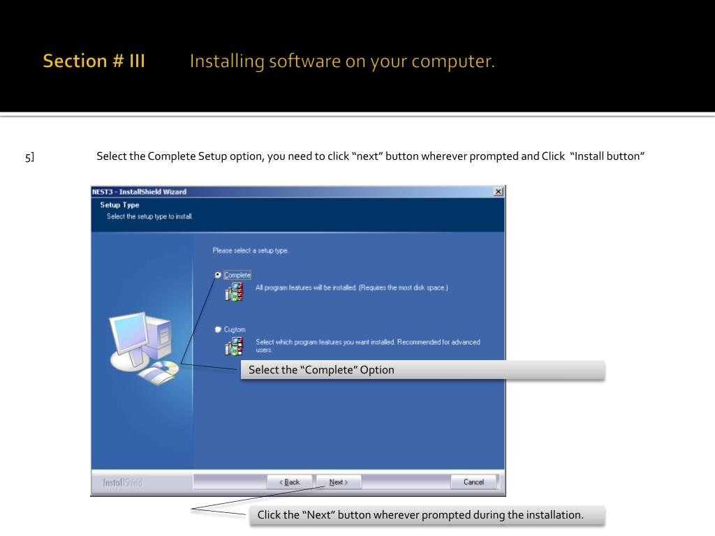 Section # III Installing software on your computer. 5] Select the Complete Setup option, you need to click “next” button wherever prompted and Click “Install button” Select the “Complete” Option Click the “Next” button wherever prompted during the installation.