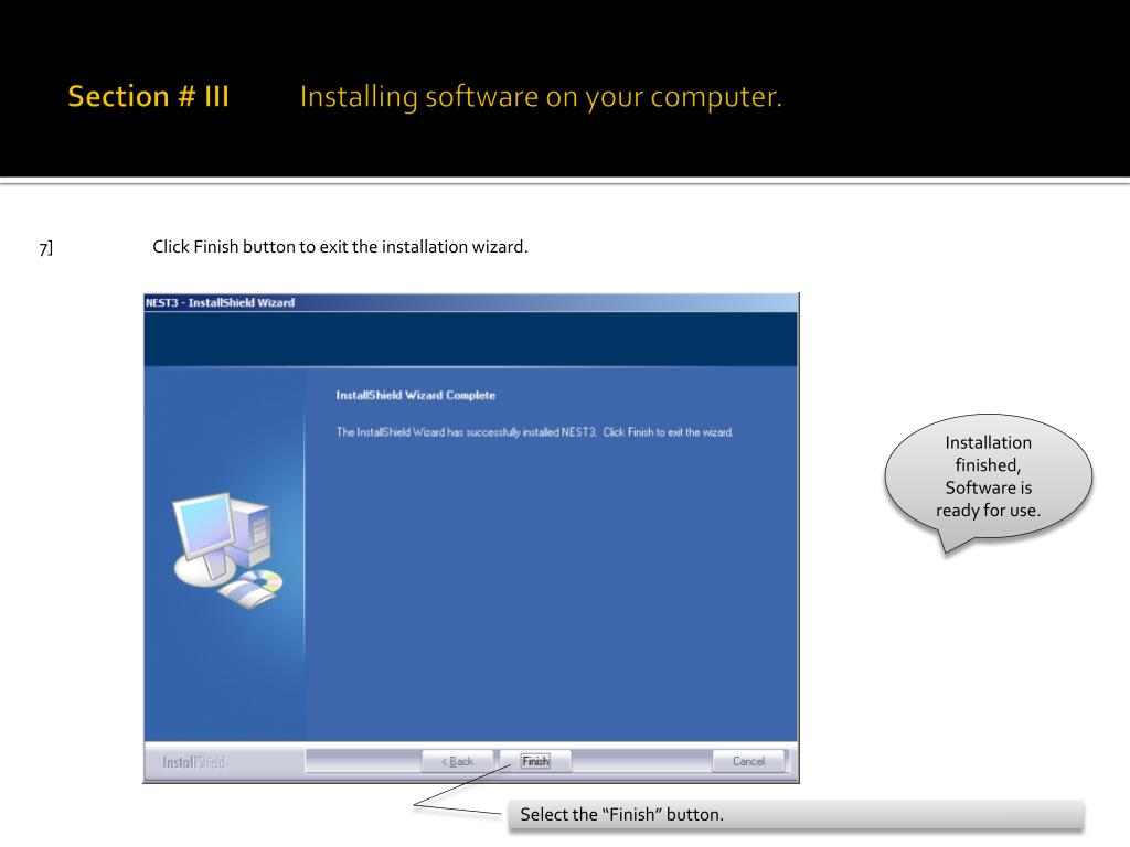 Section # III Installing software on your computer. 7] Click Finish button to exit the installation wizard. Installation finished, Software is ready for use. Select the “Finish” button.