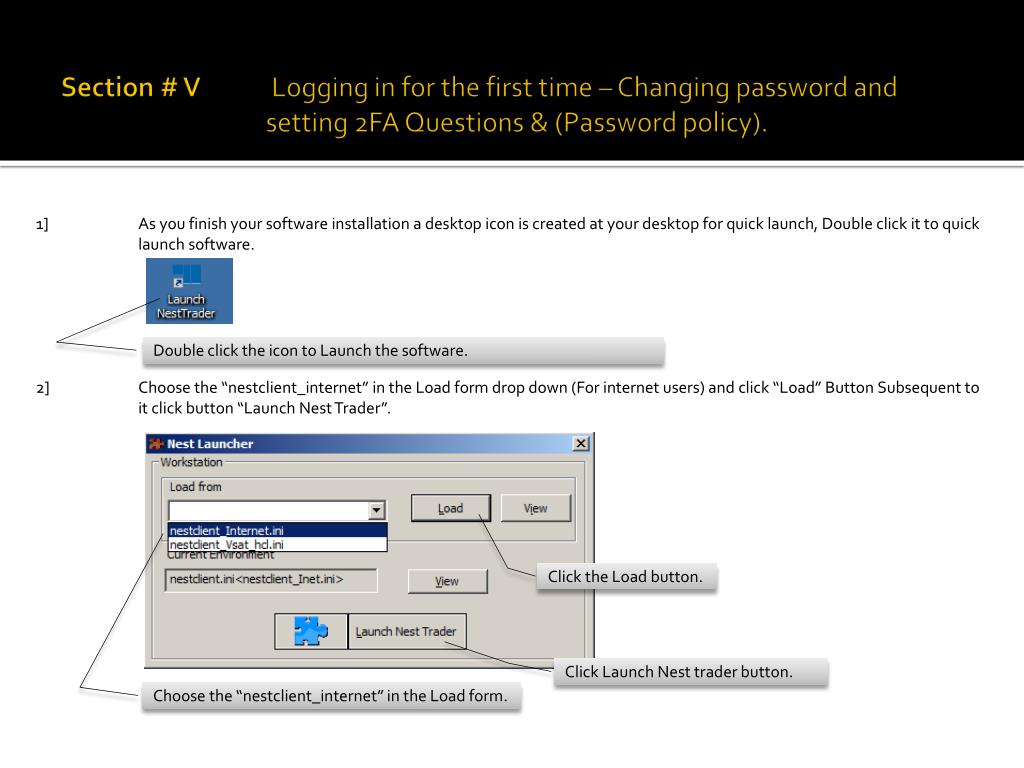 Section # V Logging in for the first time – Changing password and setting 2FA Questions & (Password policy). 1] As you finish your software installation a desktop icon is created at your desktop for quick launch, Double click it to quick launch software. 2] Choose the “nestclient_internet” in the Load form drop down (For internet users) and click “Load” Button Subsequent to it click button “Launch Nest Trader”. Double click the icon to Launch the software. Click the Load button. Click Launch Nest trader button. Choose the “nestclient_internet” in the Load form.
