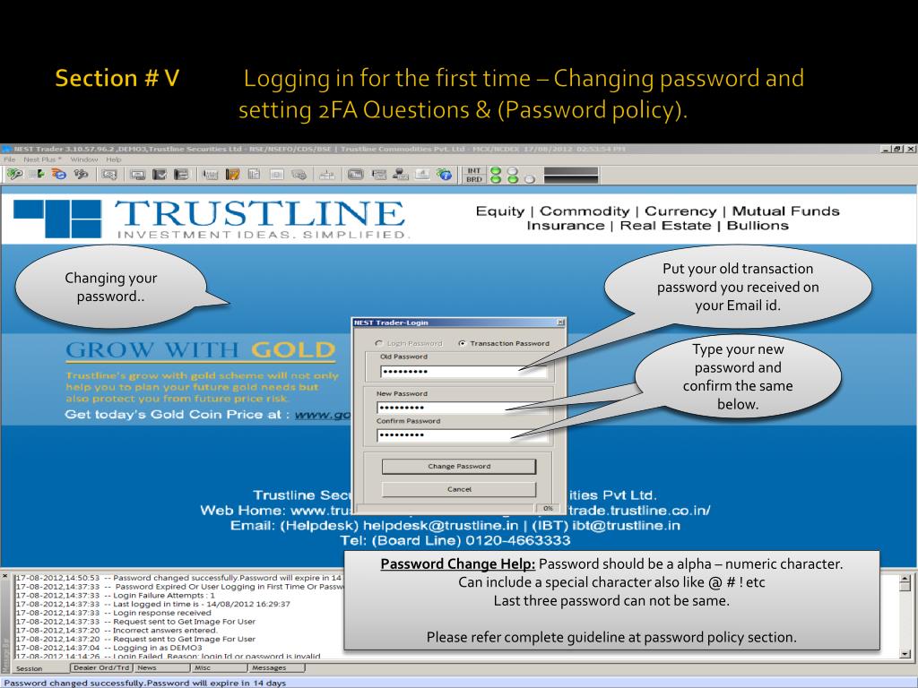 Section # V Logging in for the first time – Changing password and setting 2FA Questions & (Password policy). Changing your password.. Put your old transaction password you received on your Email id. Type your new password and confirm the same below. Password Change Help: Password should be a alpha – numeric character. Can include a special character also like @ # ! etc Last three password can not be same. Please refer complete guideline at password policy section.