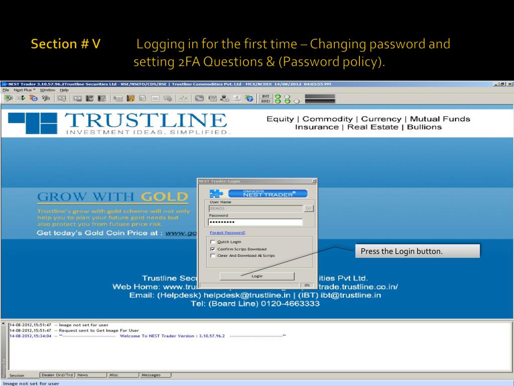 Section # V Logging in for the first time – Changing password and setting 2FA Questions & (Password policy). Press the Login button.