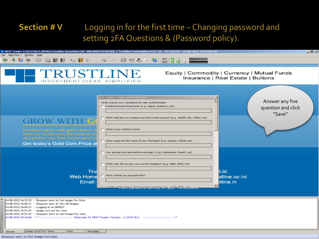 Section # V Logging in for the first time – Changing password and setting 2FA Questions & (Password policy). Answer any five question and click “Save”