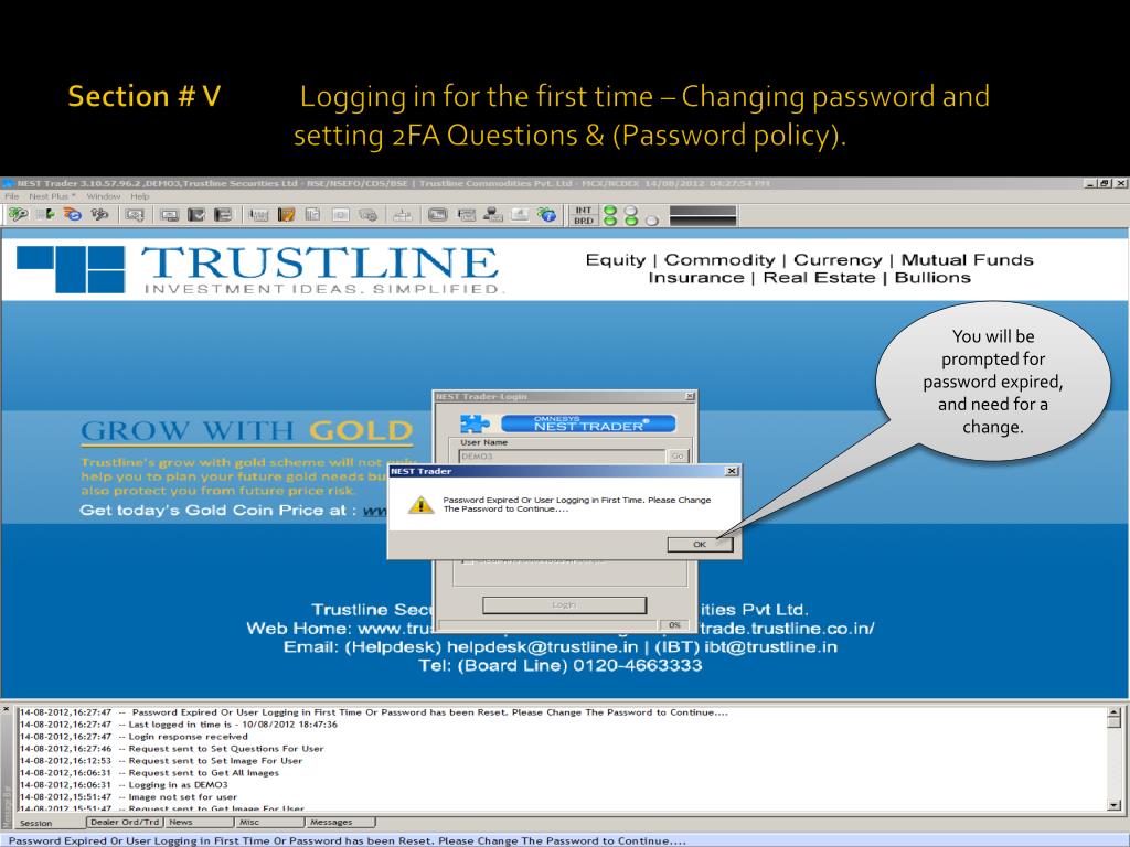 Section # V Logging in for the first time – Changing password and setting 2FA Questions & (Password policy). Software Login Window.