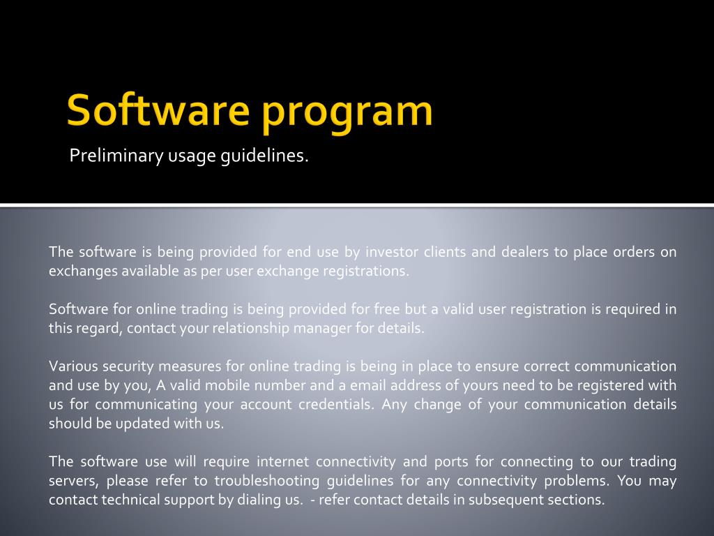 Software program Preliminary usage guidelines. The software is being provided for end use by investor clients and dealers to place orders on exchanges available as per user exchange registrations. Software for online trading is being provided for free but a valid user registration is required in this regard, contact your relationship manager for details. Various security measures for online trading is being in place to ensure correct communication and use by you, A valid mobile number and a email address of yours need to be registered with us for communicating your account credentials. Any change of your communication details should be updated with us. The software use will require internet connectivity and ports for connecting to our trading servers, please refer to troubleshooting guidelines for any connectivity problems. You may contact technical support by dialing us. - refer contact details in subsequent sections.