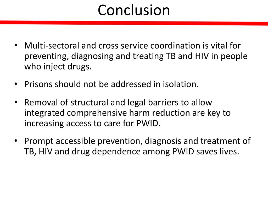 Conclusion • Multi-sectoral and cross service coordination is vital for preventing, diagnosing and treating TB and HIV in people who inject drugs. • Prisons should not be addressed in isolation. • Removal of structural and legal barriers to allow integrated comprehensive harm reduction are key to increasing access to care for PWID. • Prompt accessible prevention, diagnosis and treatment of TB, HIV and drug dependence among PWID saves lives.