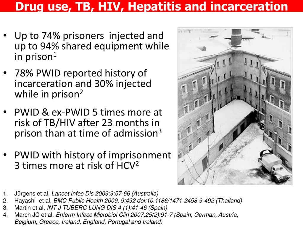 Drug use, TB, HIV, Hepatitis and incarceration • Up to 74% prisoners injected and up to 94% shared equipment while in prison1 • 78% PWID reported history of incarceration and 30% injected while in prison2 • PWID & ex-PWID 5 times more at risk of TB/HIV after 23 months in prison than at time of admission3 • PWID with history of imprisonment 3 times more at risk of HCV2 • Jürgens et al, Lancet Infec Dis 2009;9:57-66 (Australia) • Hayashi et al, BMC Public Health 2009, 9:492 doi:10.1186/1471-2458-9-492 (Thailand) • Martin et al, INT J TUBERC LUNG DIS 4 (1):41-46 (Spain) • March JC et al. EnfermInfeccMicrobiolClin 2007;25(2):91-7 (Spain, German, Austria, Belgium, Greece, Ireland, England, Portugal and Ireland)